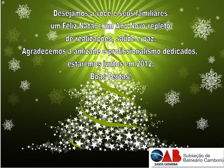 A DELEGACIA DA CAIXA DE ASSISTÊNCIA DOS ADVOGADOS DE SANTA CATARINA - CAASC - na 15ª Subseção da OAB/SC, através de seu Delegado, Dr. Paulo Cavalheiro Mendes, deseja a todos (as) Advogados (as) e familiares um FELIZ NATAL e um ANO NOVO repleto de PAZ, SAÚDE E PROSPERIDADE